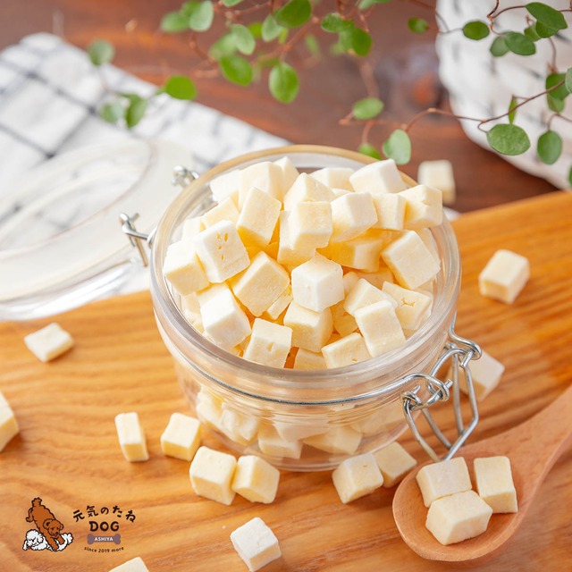 ※現在(2026.1)チーズの大きさが違います。 一時的に形状が少し違い、キューブ状ではなく長方形でキューブ状のチーズを2つ並べた感じです。 (同じ商品でキューブにカットする前の商品です) ●希少なチェダーチーズを使用しました!フリーズドライチーズとは チーズを急速凍結させた後、真空状態で水分を昇華させることで乾燥させたサックサクの乾燥チーズです。 ●チーズは別名「白いお肉」とも呼ばれるほど、体つくりの基礎となるタンパク質が豊富なので、わんちゃんはもちろん小さいお子様からご年配の方までご一緒にお召し上がり頂けます。 ●指で簡単に潰れますのでご飯の上にふりかけてあげれば、愛犬大喜び間違いなし! ※製造工程に関係なくその時期に食べている草等で原材料の乳牛に含まれる成分濃度が異なり チーズの色ムラや味の濃さにバラツキがあります事ご了承ください。