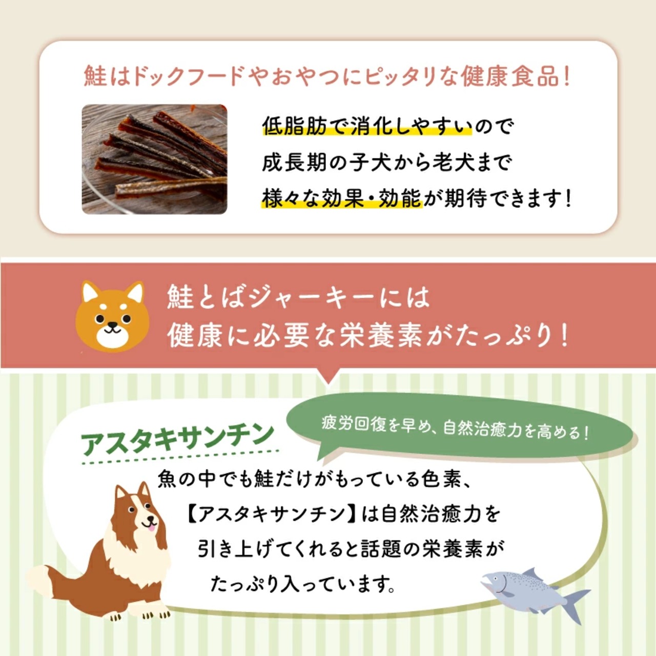 ●鮭は低脂肪で消化しやすいので成長期の子犬から老犬まで様々な効果・効能が期待出来るのでドックフードやおやつで取り入れるのにはおススメです!