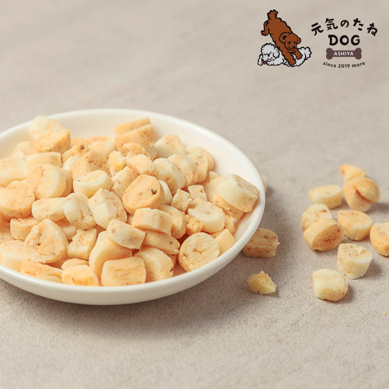 ●小麦、砂糖、卵を使用しないグルテンフリーにこだわりました。米粉をベースに、わんちゃ大好きチーズと美味しさを引き立てる為に蜂蜜を加え、カロリーが少ない鹿肉を粉末にした物を混ぜ合わせて美味しく低カロリーに仕上げました。